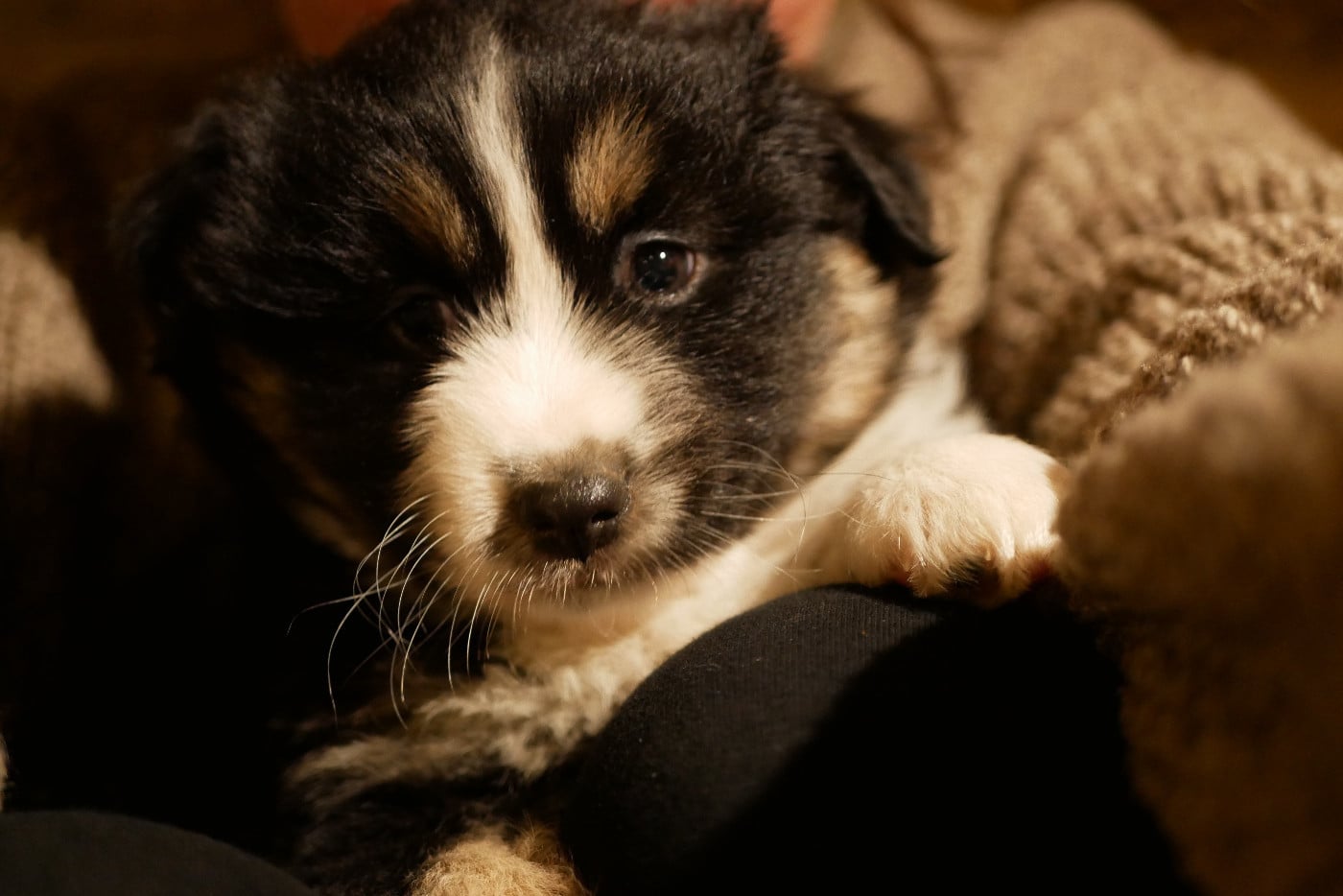 Une petite femelle noir tricolore, avec un gros collier de poils blancs, mais que sur la moitié du cou !