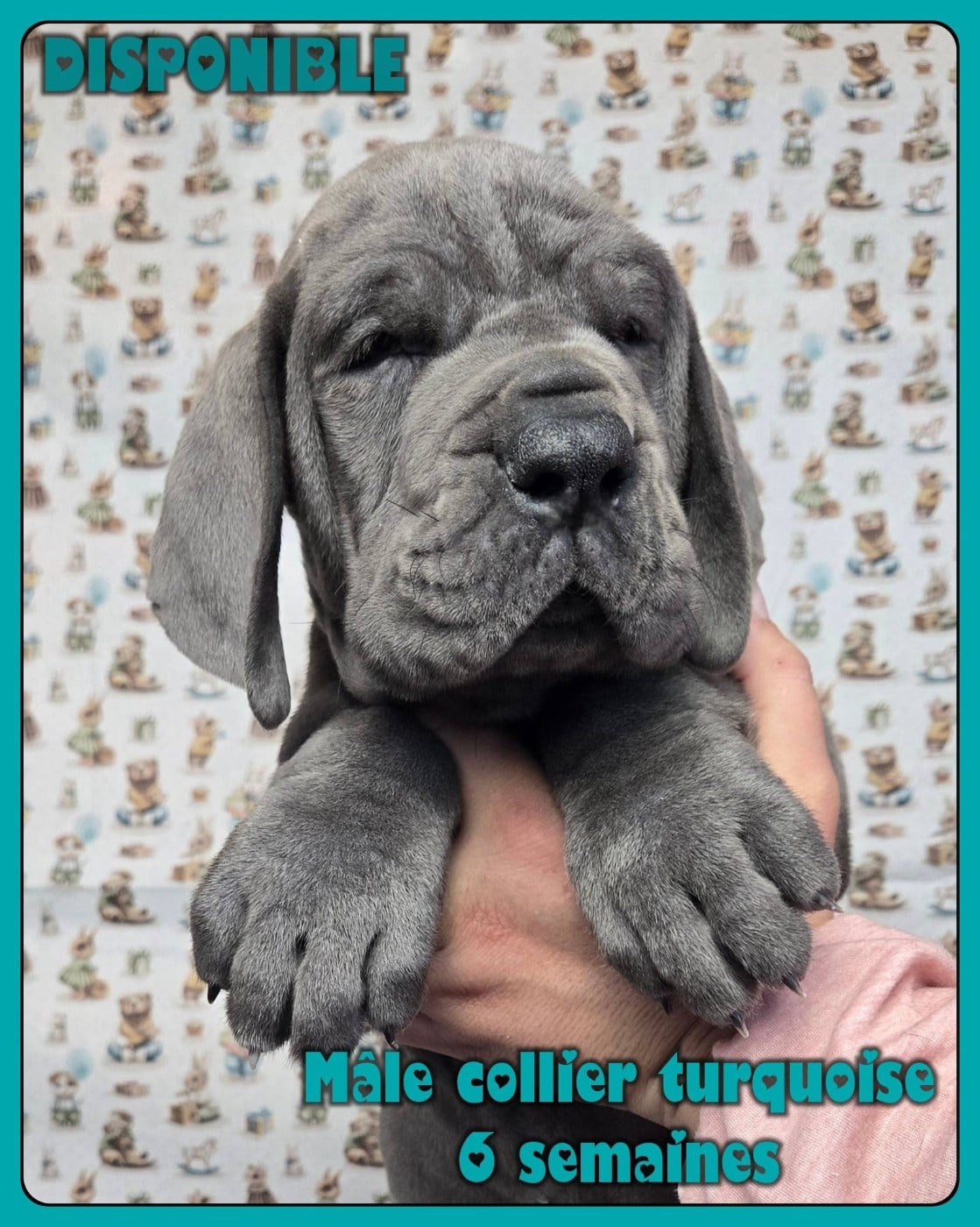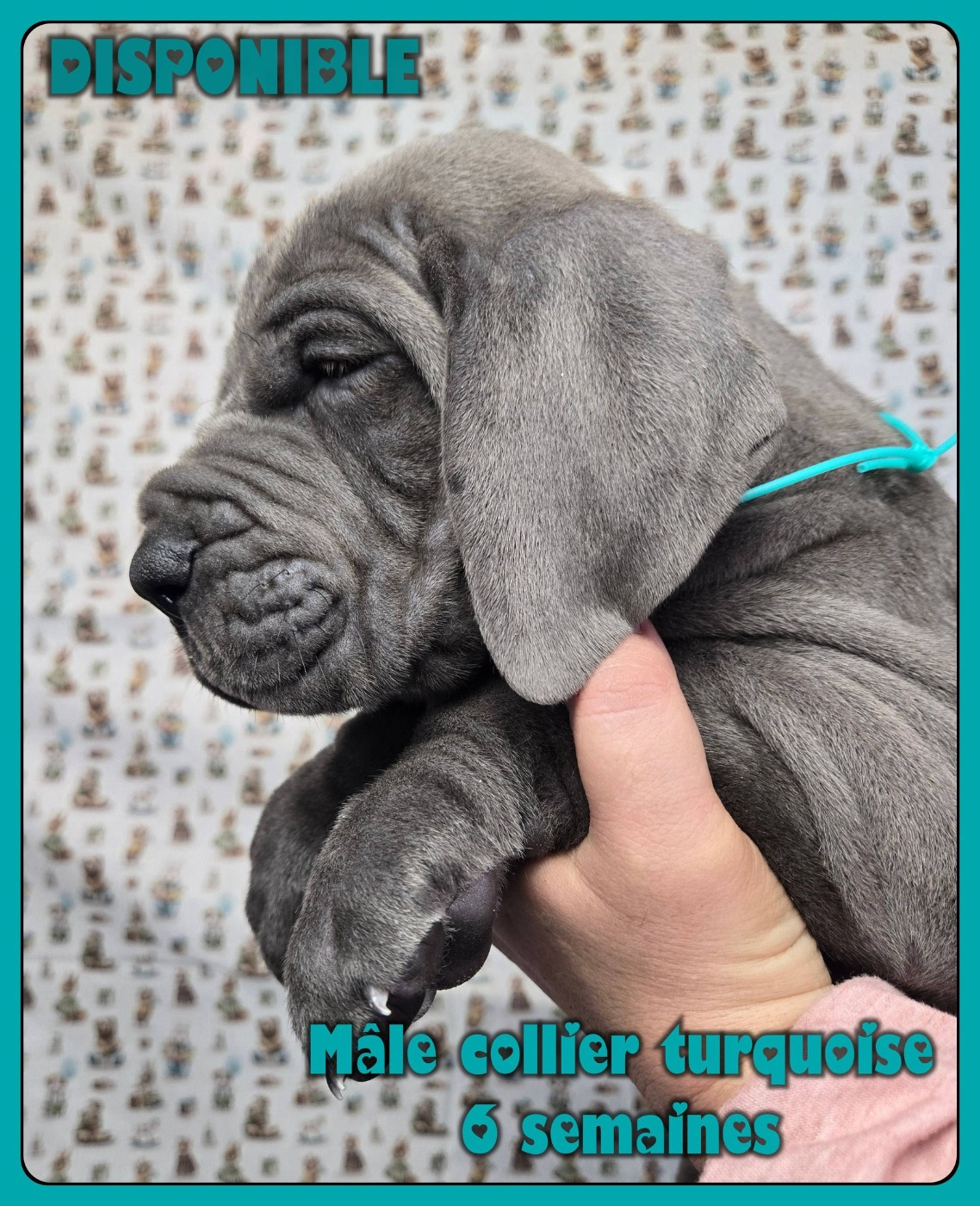 Chiots Dogue allemand Mâle collier turquoise de la Lande des Géants Bleus