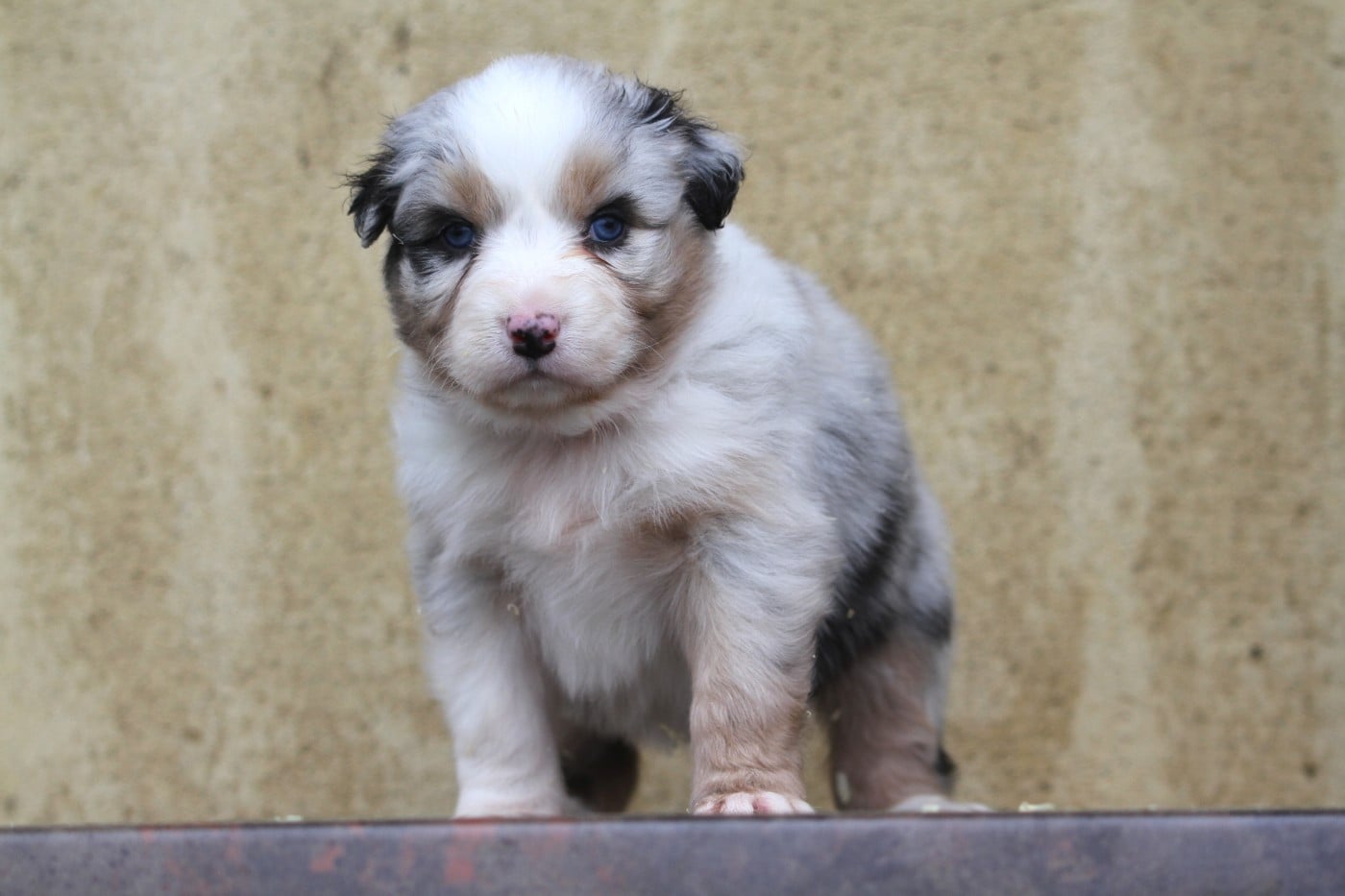 Femelle disponible à la réservation bleu merle aux yeux bleus, queue naturellement courte. Parents indemnes de dysplasie des hanches (AA pour les deux) et des coudes (ED-0 pour les deux), indemnes APR HSF4 MDR1 AOC, indemnes tares oculaires. Chiots élevés en famille, sociabilisés, habitués aux autres chiens, chats et chevaux. Pas de cages, chiens vivant en parc. Plus d'informations au 06 17 33 81 92