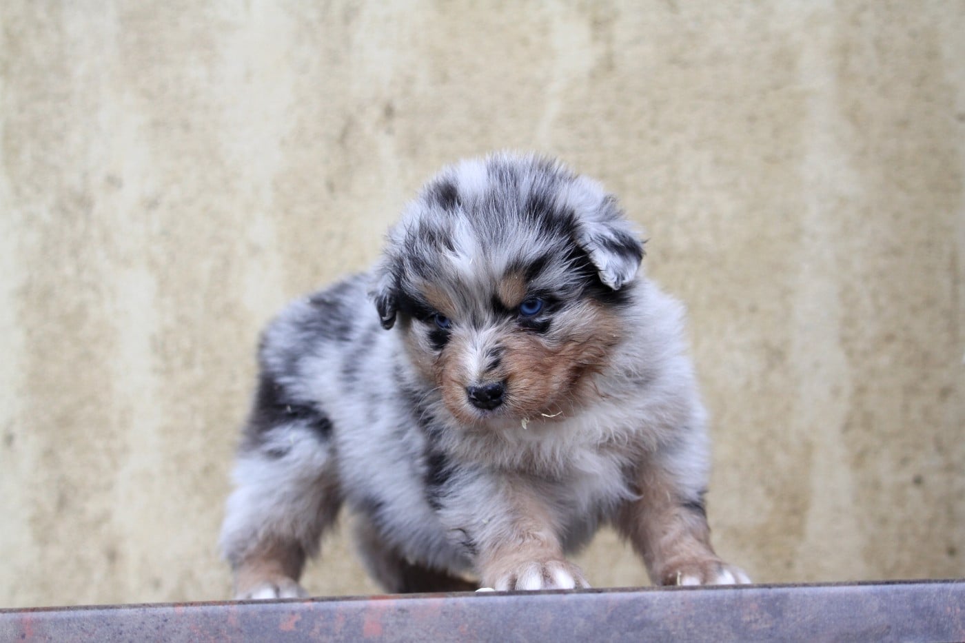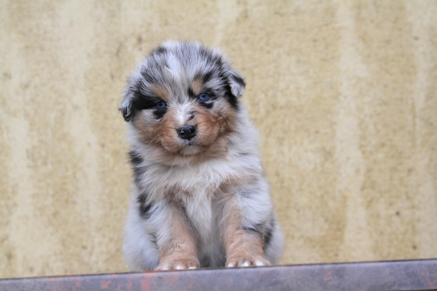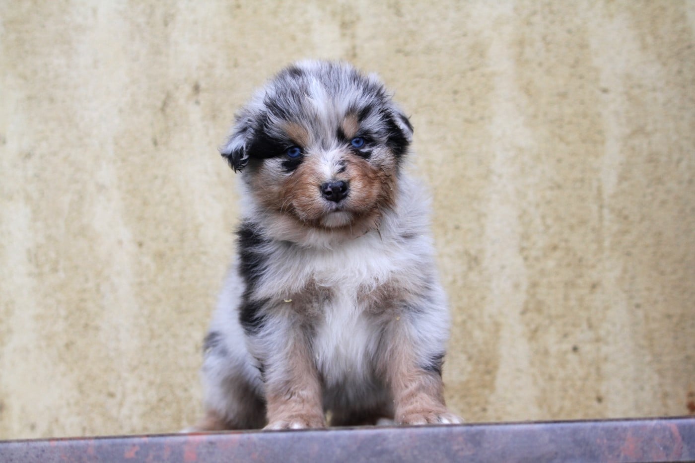 Mâle disponible à la réservation bleu merle aux yeux bleus, queue naturellement courte. Parents indemnes de dysplasie des hanches (AA pour les deux) et des coudes (ED-0 pour les deux), indemnes APR HSF4 MDR1 AOC, indemnes tares oculaires. Chiots élevés en famille, sociabilisés, habitués aux autres chiens, chats et chevaux. Pas de cages, chiens vivant en parc. Plus d'informations au 06 17 33 81 92