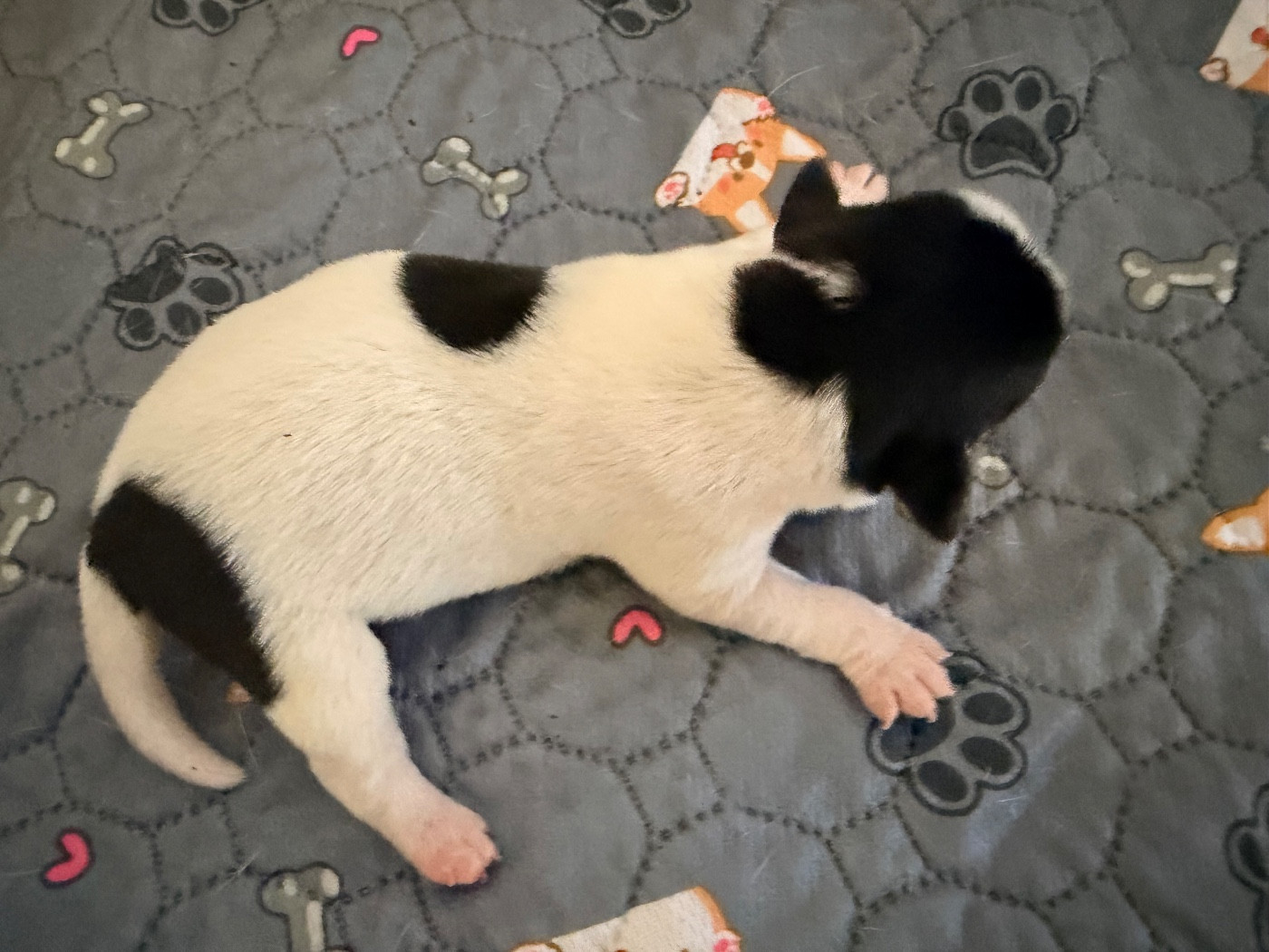 Baba au Rhum est un chiot à la robe blanche avec de superbes taches noires bien réparties sur la tête et sur le corps, lui donnant une allure très élégante et un marquage particulièrement harmonieux.