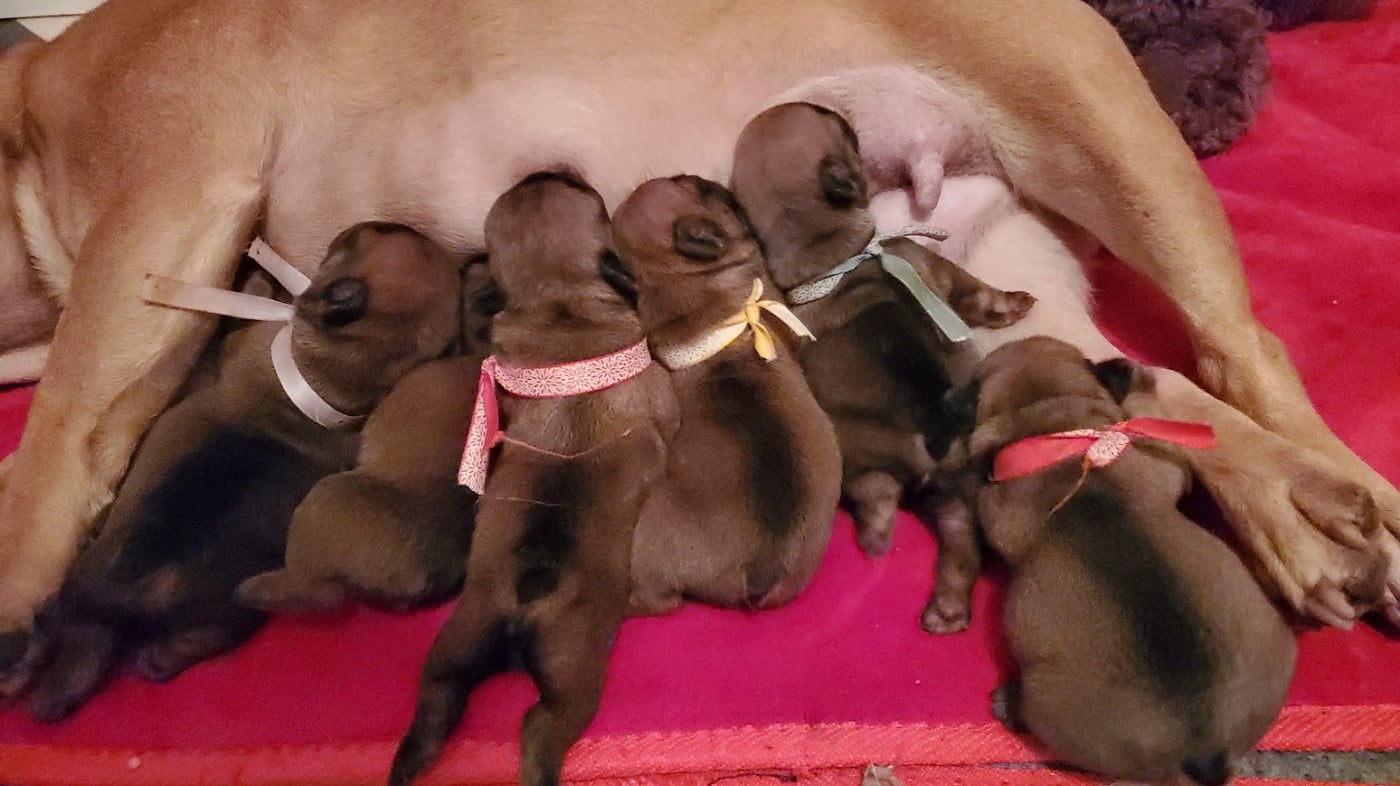 collier jaune puis vert- un magnifique chiot né par césarienne, tête large, front bombé, nez présent charbonneux, il affiche un corps court et compact tres harmonieux de couleur rouge acajou, il sera puissant avec une superbe encolure déjà présente, l'ossature est là, fidèle petit fils de grand a'ne BENJI, ADES a de qui tenir... on attend de le voir grandir...je me languis ! valeur sure !