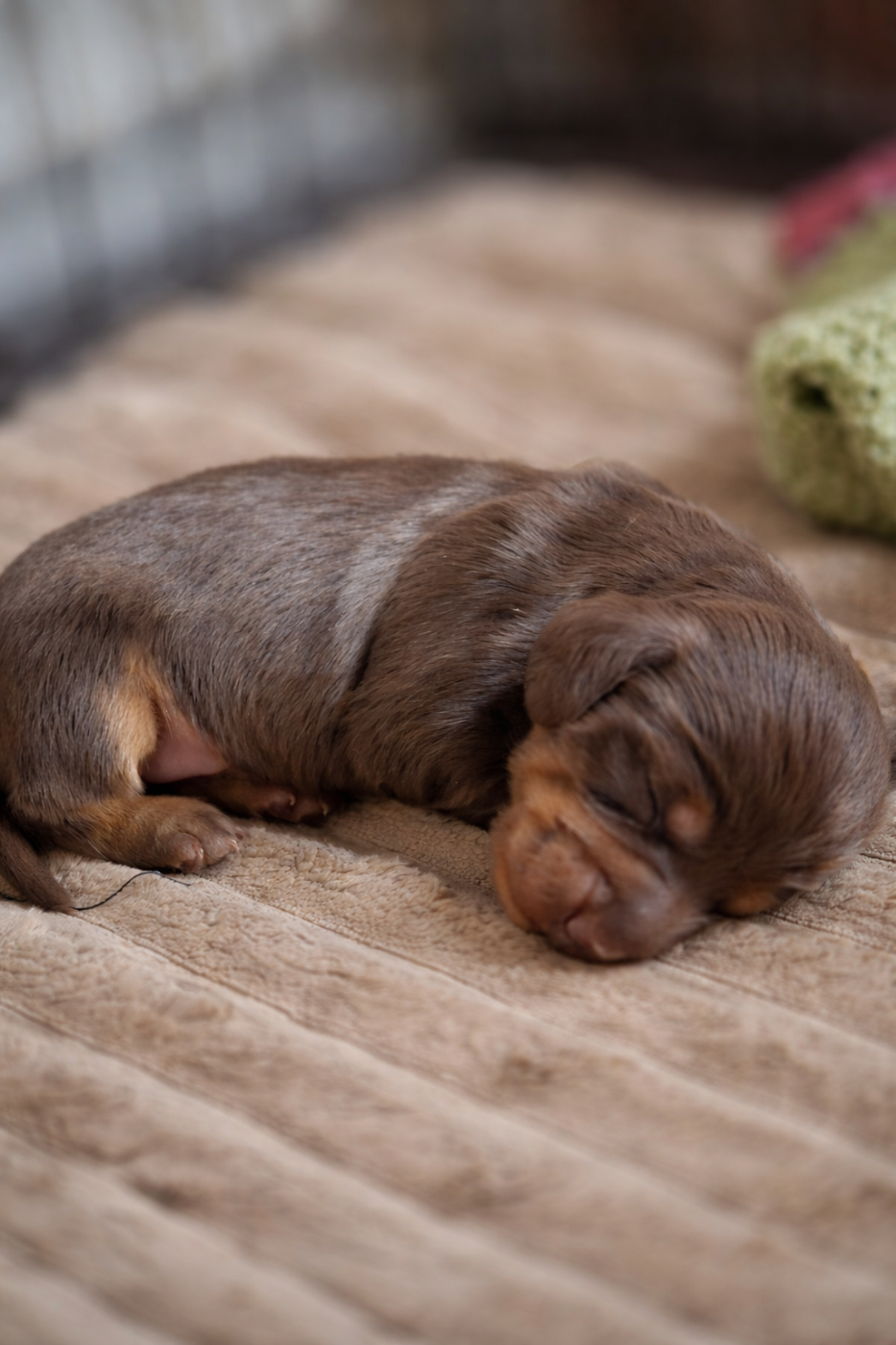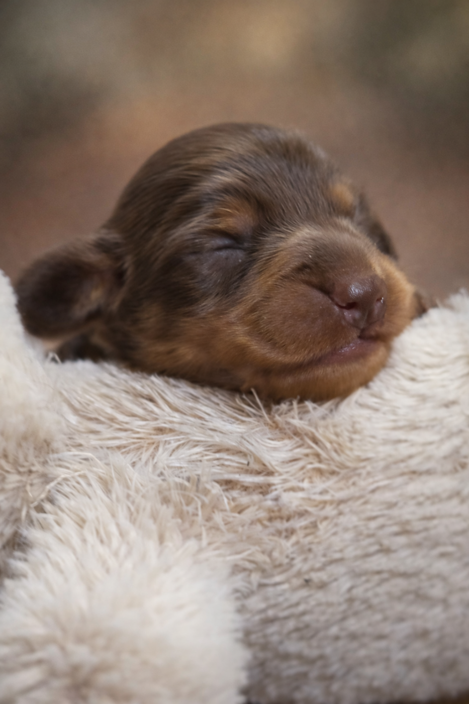 Magniffique femelle Teckel poil long nain/ kaninchen LOF, de couleur chocolat, issue de parents LOF testés et indemnes pour les maladies génétiques propres à la race.