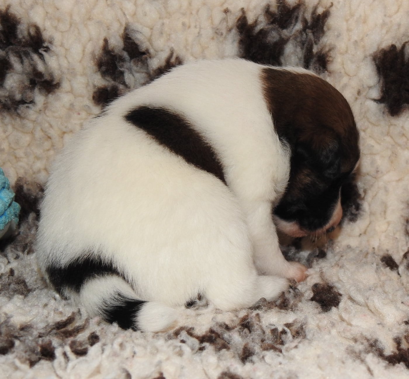 Joli chiot mâle blanc et tan foncé le corps coloré et une tache à la queue.