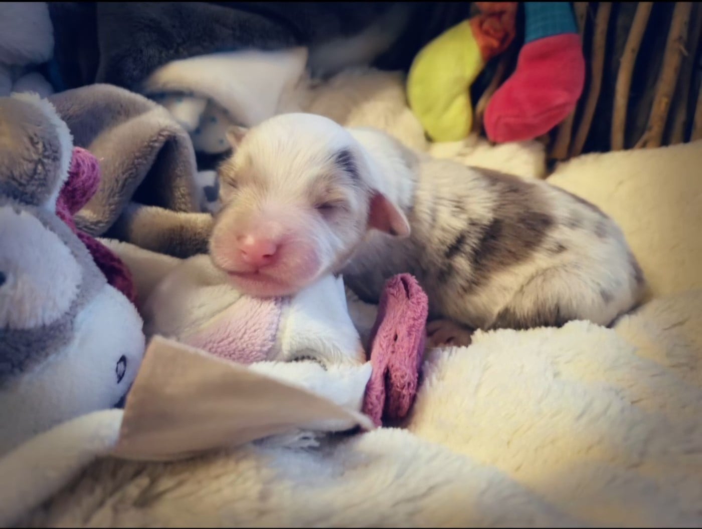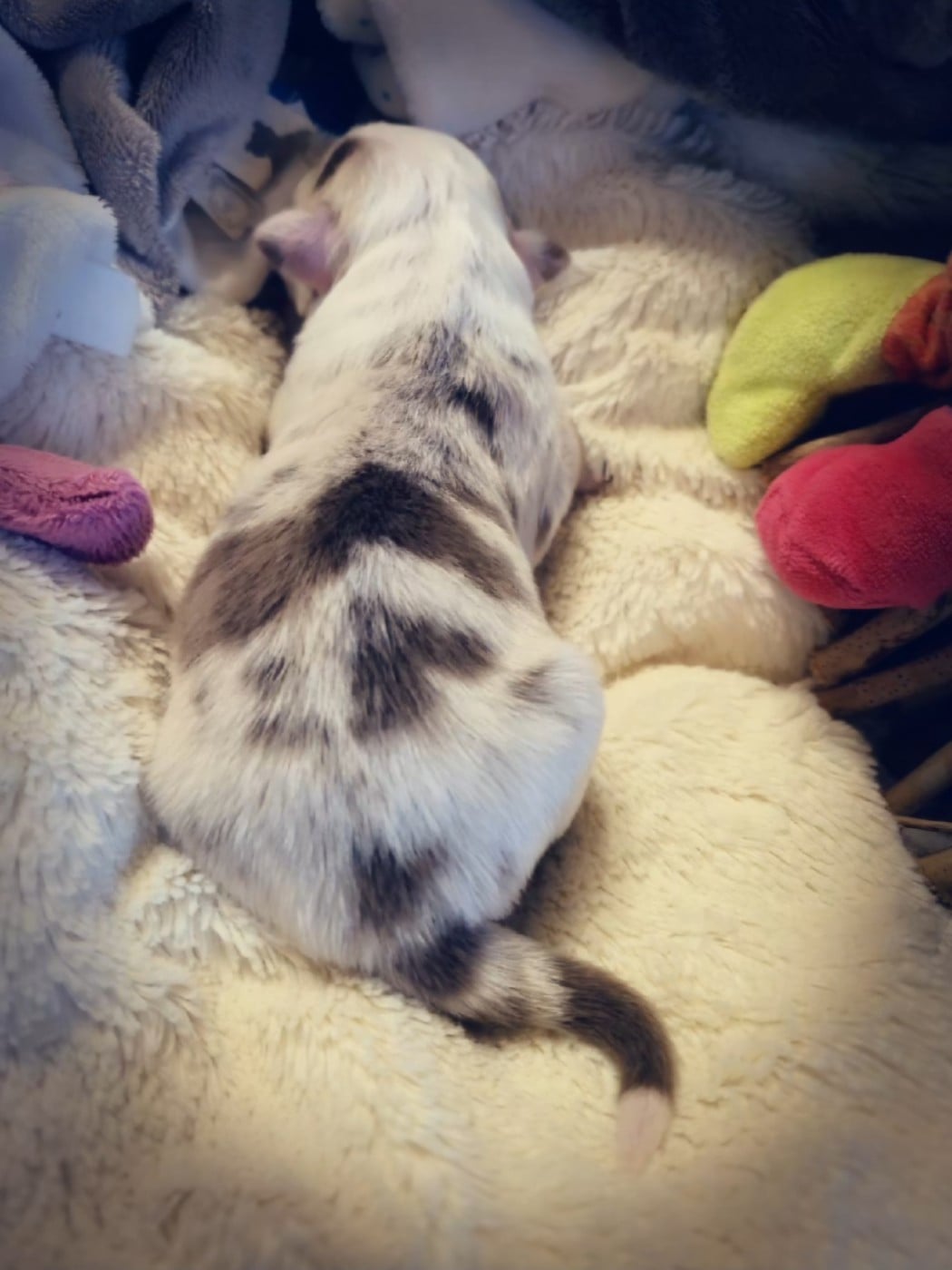 Becky est rouge merle tricolore à panachures blanches...c est une rouge merle plus claire..