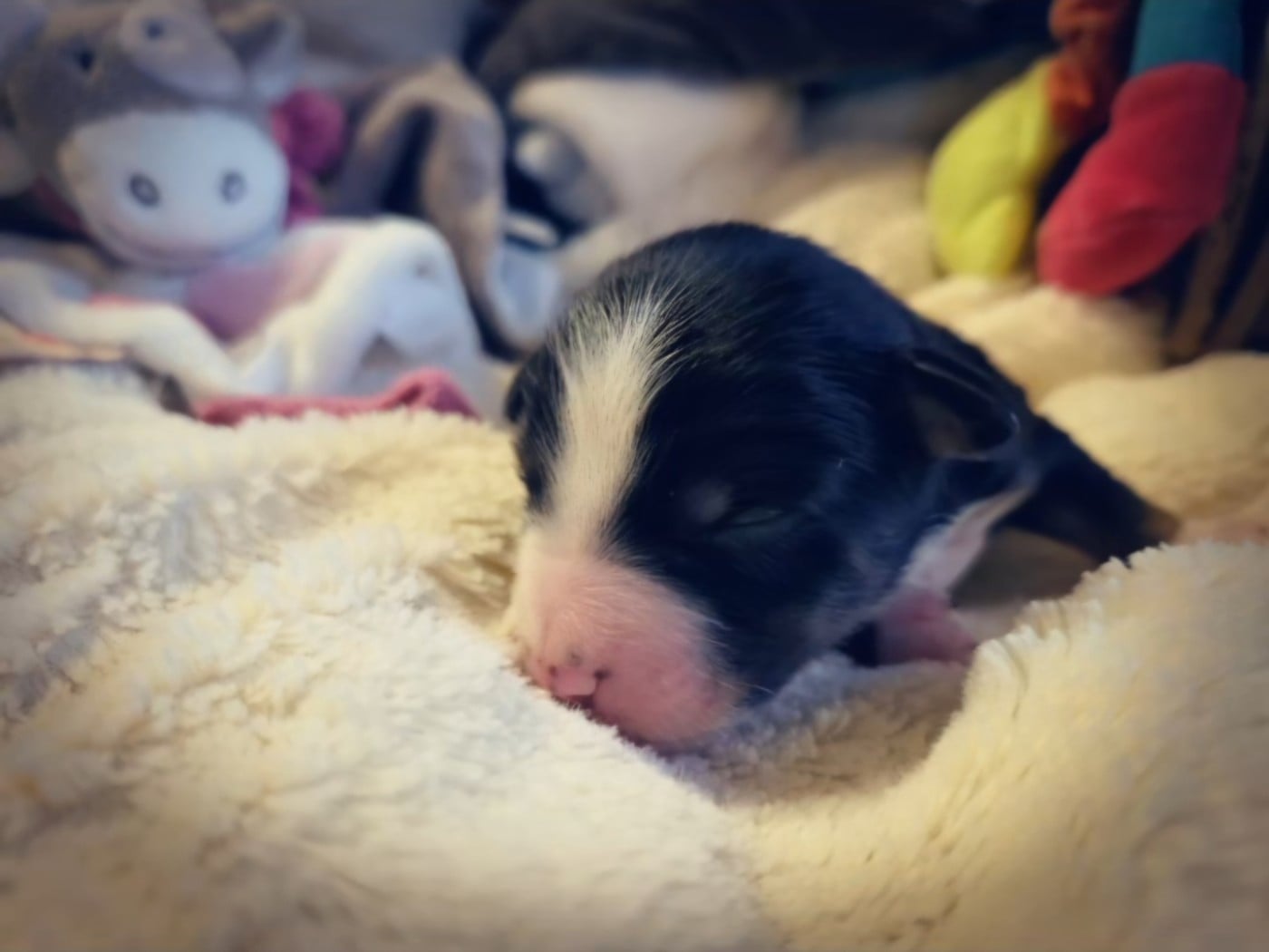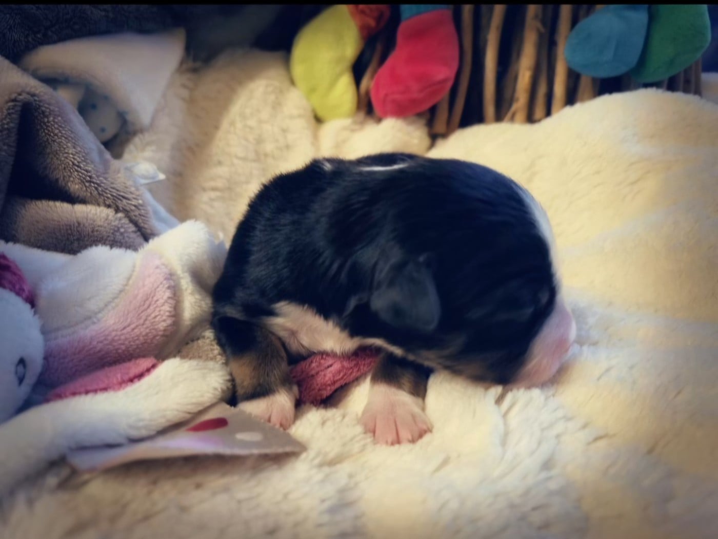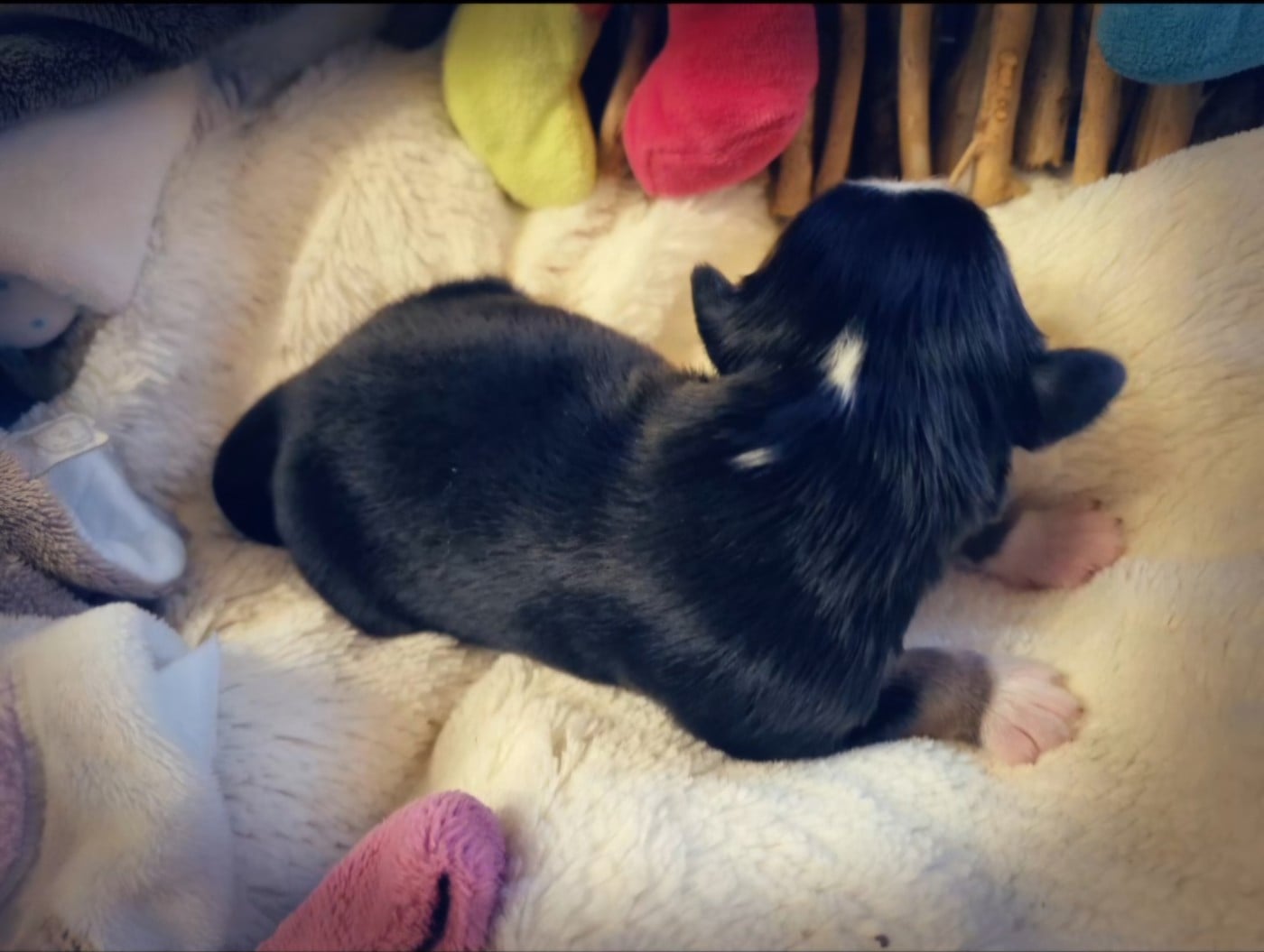 Bella est noire tricolore a panachures blanches avec 2 petites tâches blanches sur la nuque...