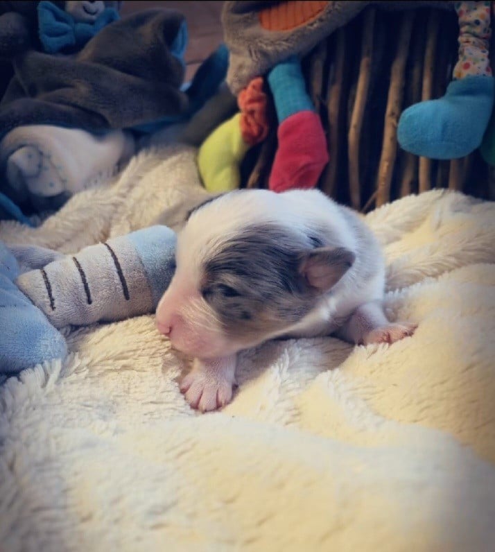 Buddy est bleu merle tricolore a panachures blanches...