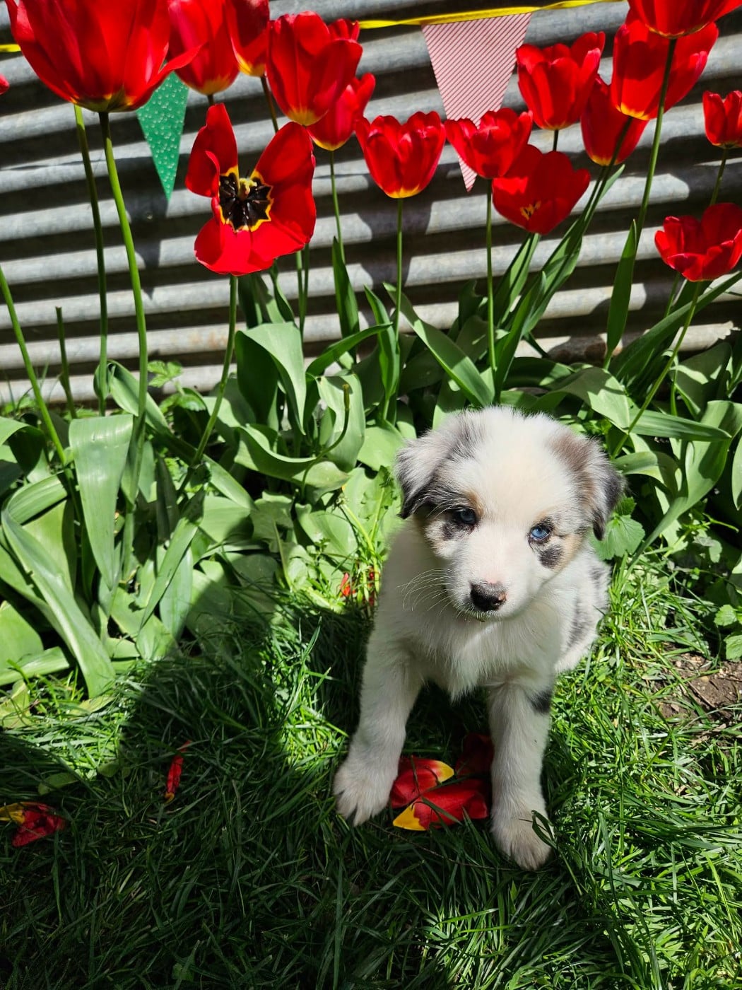Petit chien bleu merle aux yeux bleus élevé en famille en présence d'enfants et sera habitué aux chats car un chat vit à la maison et sera donc à son contact jusqu'à son départ. Il sera donc manipulé et sociable.