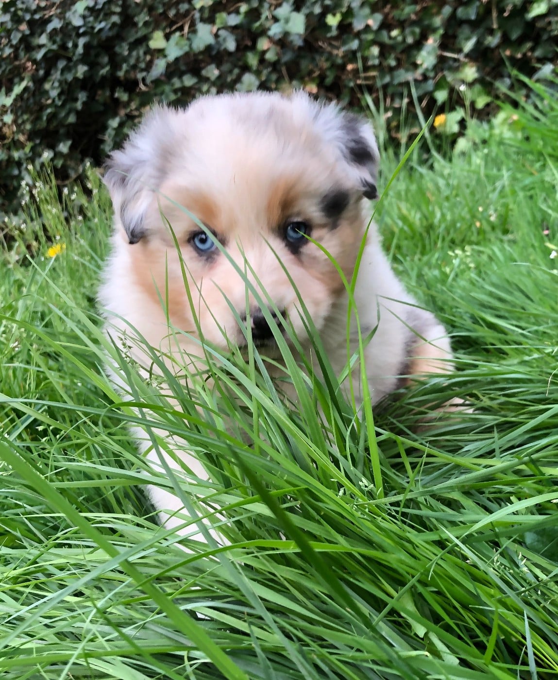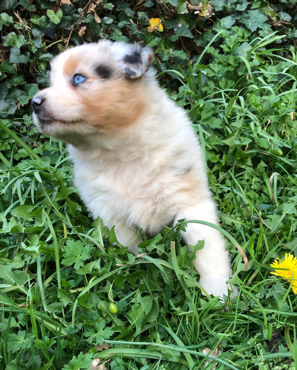 Très joli chiot aux yeux bleu et queue longue.