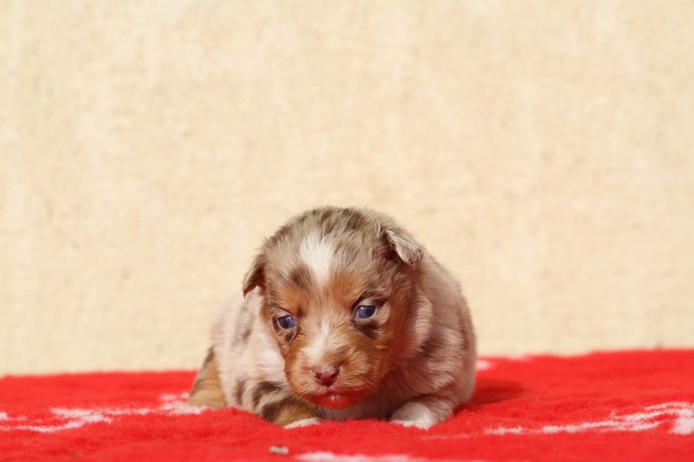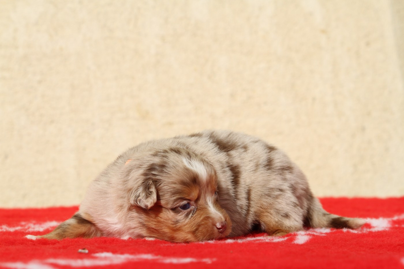 Femelle rouge merle à la queue longue disponible à la réservation. Parents indemnes de dysplasie des hanches (AA pour les deux) et des coudes (ED-0 pour les deux), dépistés AOC APR-prcd CMR1 HSF4 MDR1 NCL-6, indemnes tares oculaires. Chiots élevés en famille, sociabilisés, habitués aux autres chiens, chats et chevaux. Pas de cages, chiens vivant en parc. Plus d'informations au 06 17 33 81 92