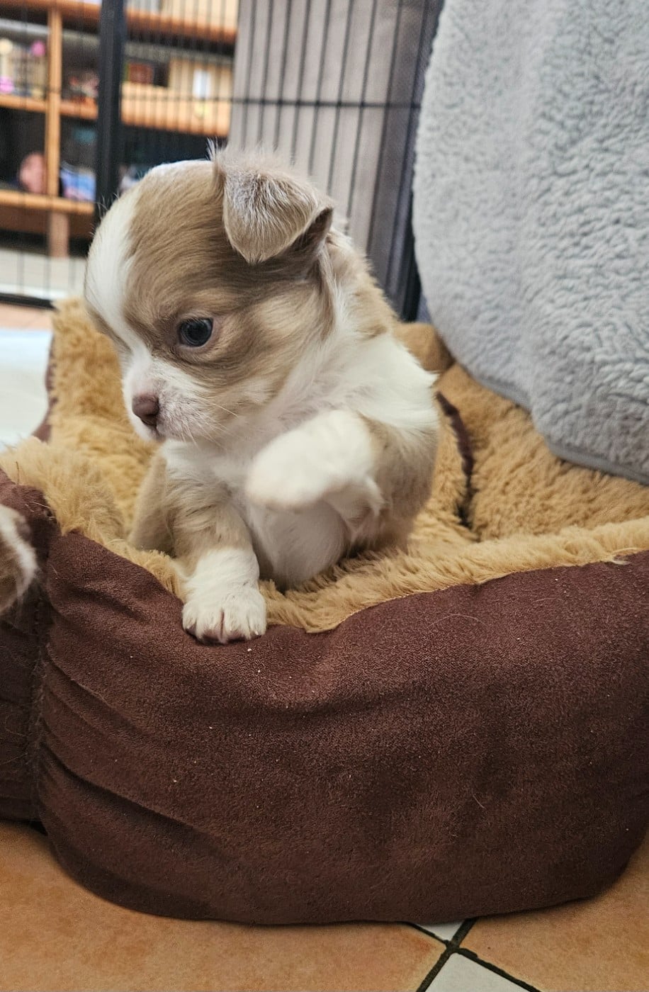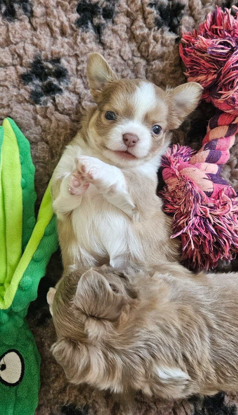 Chiots Chihuahua Mâle chocolat dilué et blanc Des Perles Du Plessis