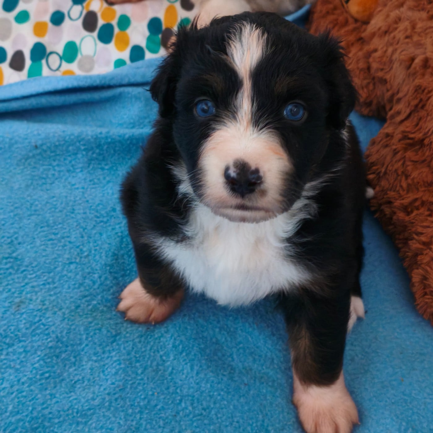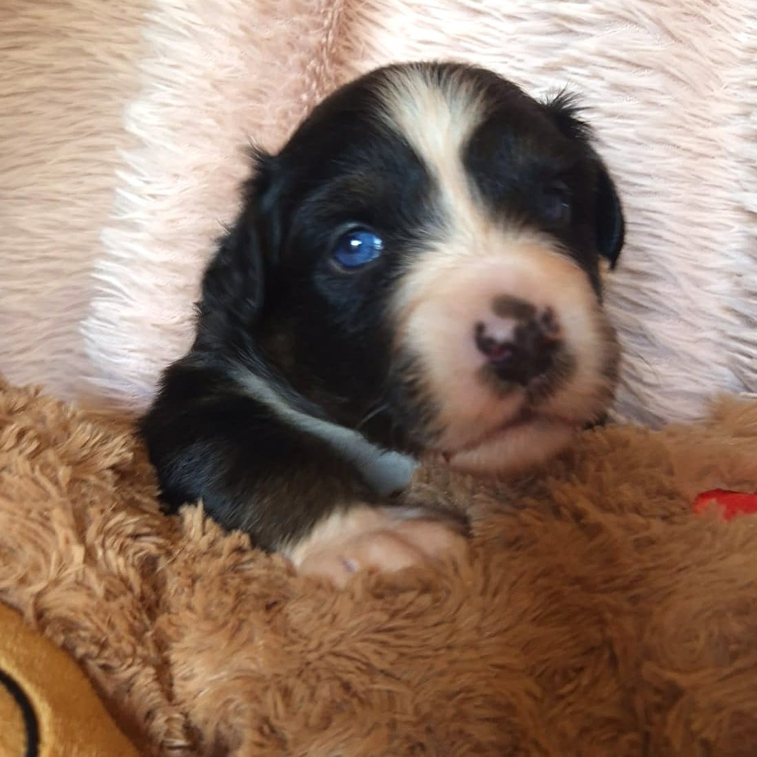 Petite louloute noir tricolore intrépide et gourmande c'est l'aventurière de la portée. Beyala est une petite puce avec du caractère elle sait ce qu'elle veut ;) Yeux bleus