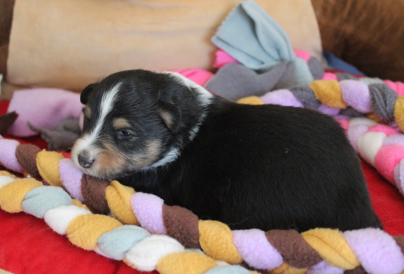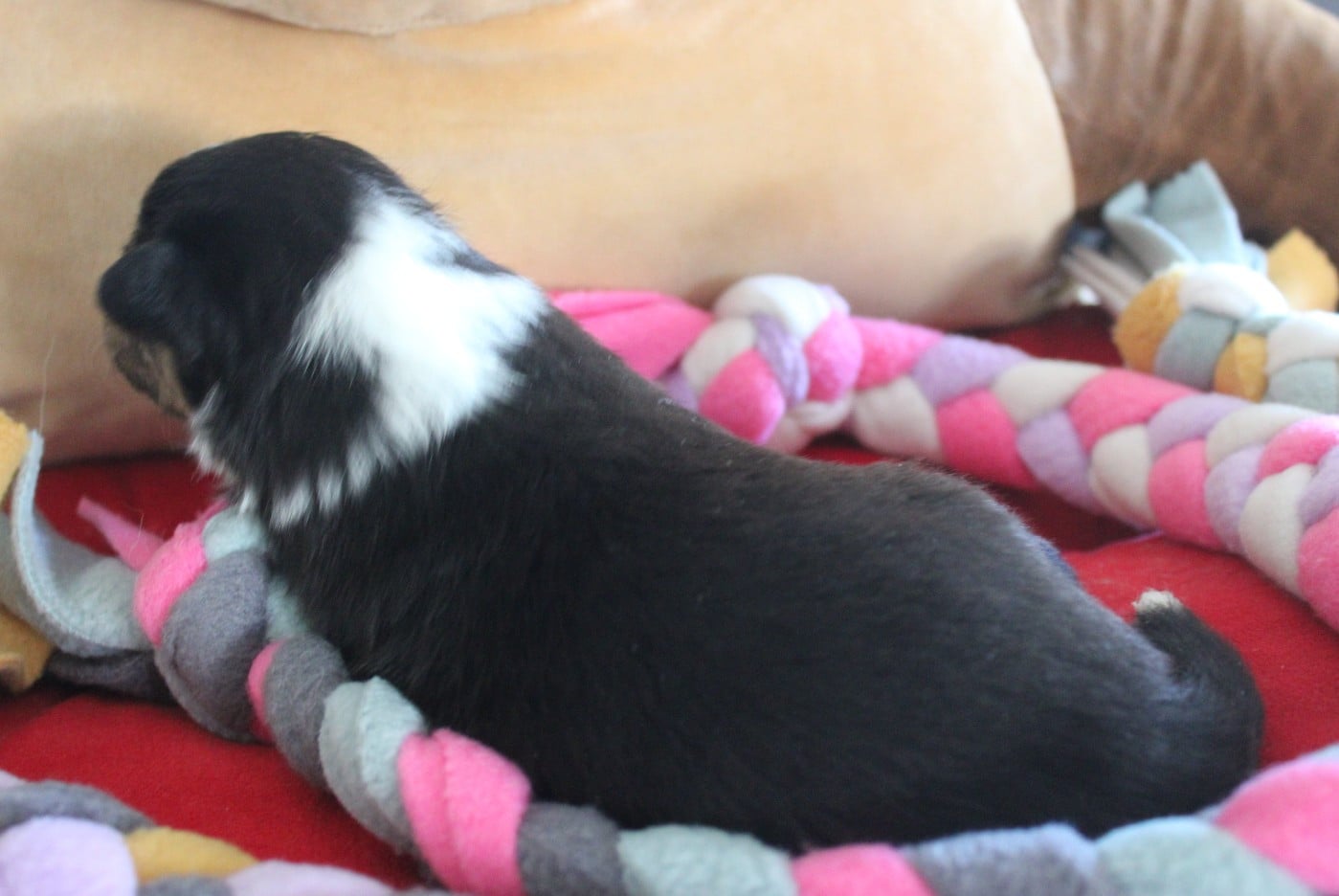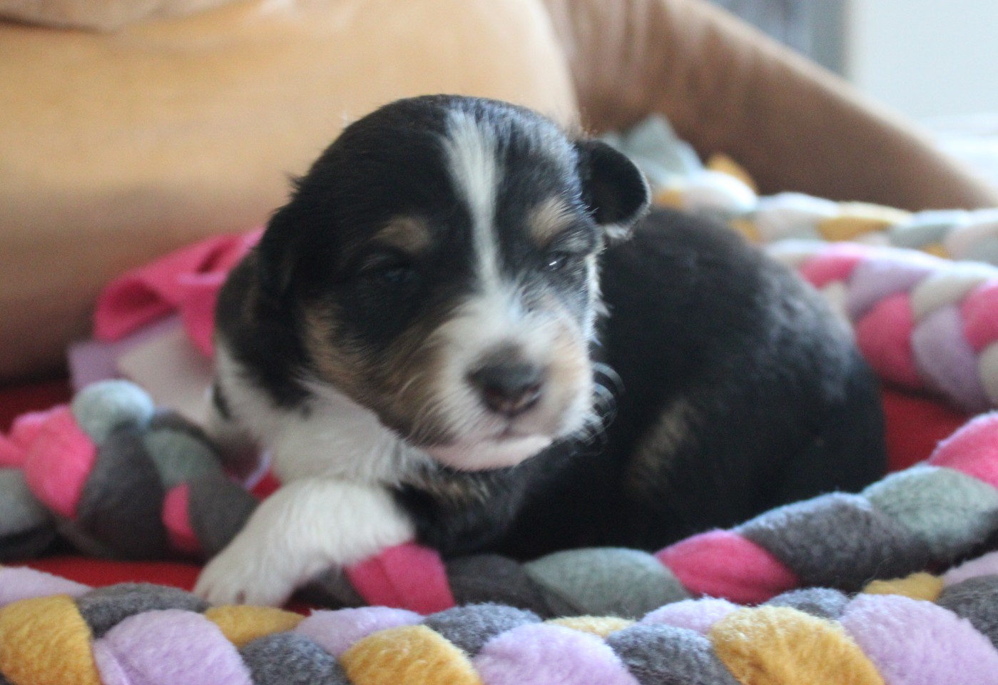 Male noir tricolore. Chiot élevé en famille, Les chiots vivent dans le salon au milieu de la meute. Ils sont habitués aux bruits de la maison. Chiot vendu pour compagnie. Il partira de l'élevage identifié, entièrment vacciné, vermifugé et muni d'un passeport.