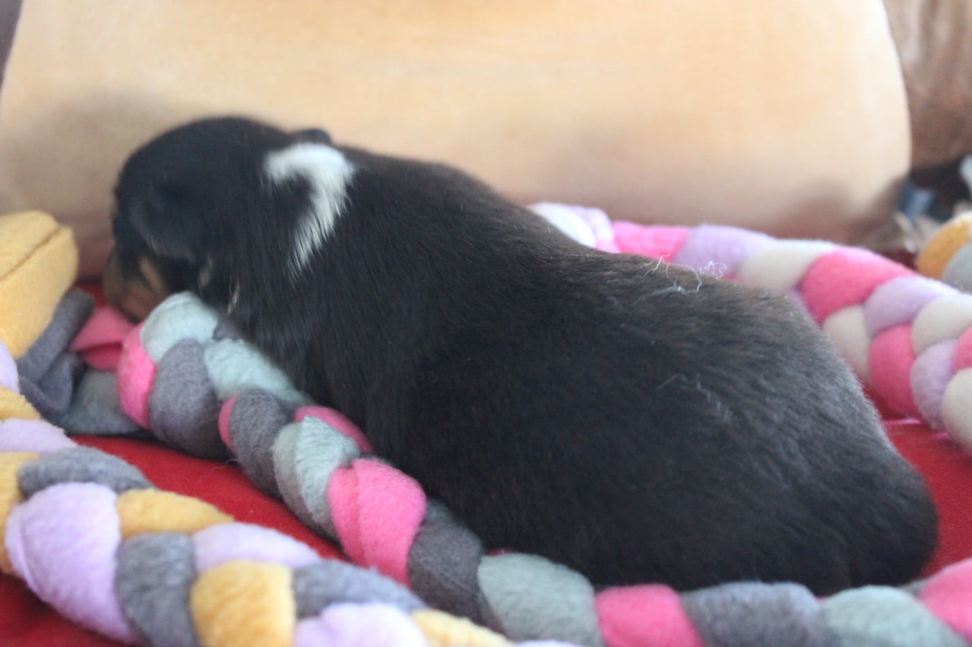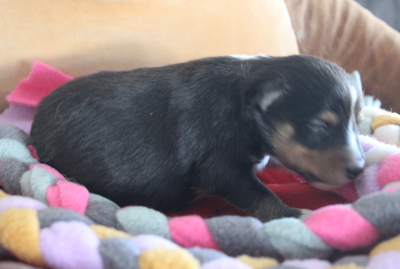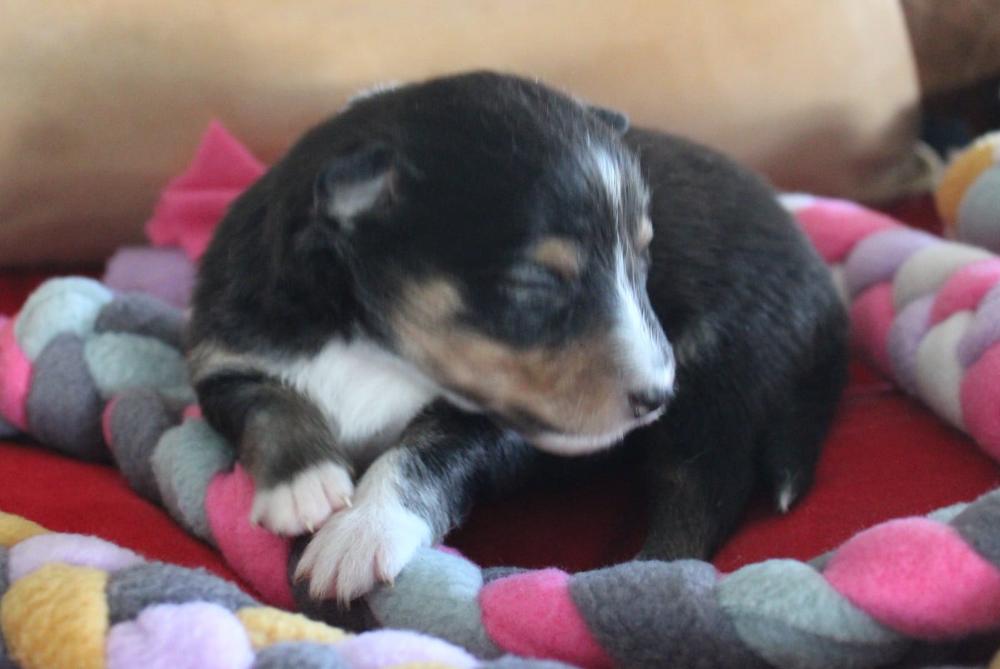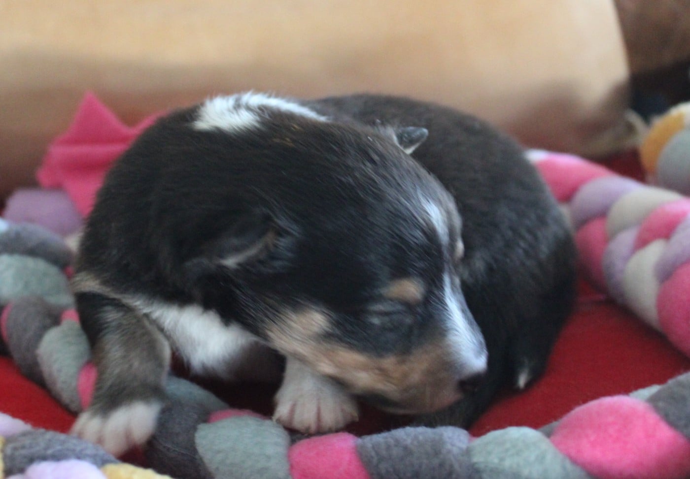 Femelle Noir Tricolore. Chiot élevé en famille, Les chiots vivent dans le salon au milieu de la meute. Ils sont habitués aux bruits de la maison. Chiot vendu pour compagnie. Elle partira de l'élevage identifiée, entièrment vaccinée, vermifugée et munie d'un passeport.