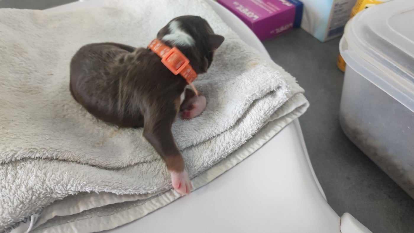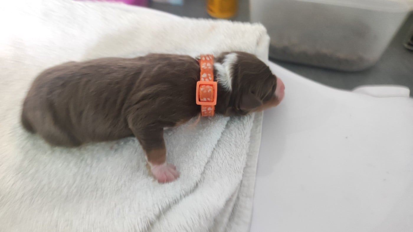 Femelle rouge tricolore née à 22h59. Poids à la naissance 390 grammes.