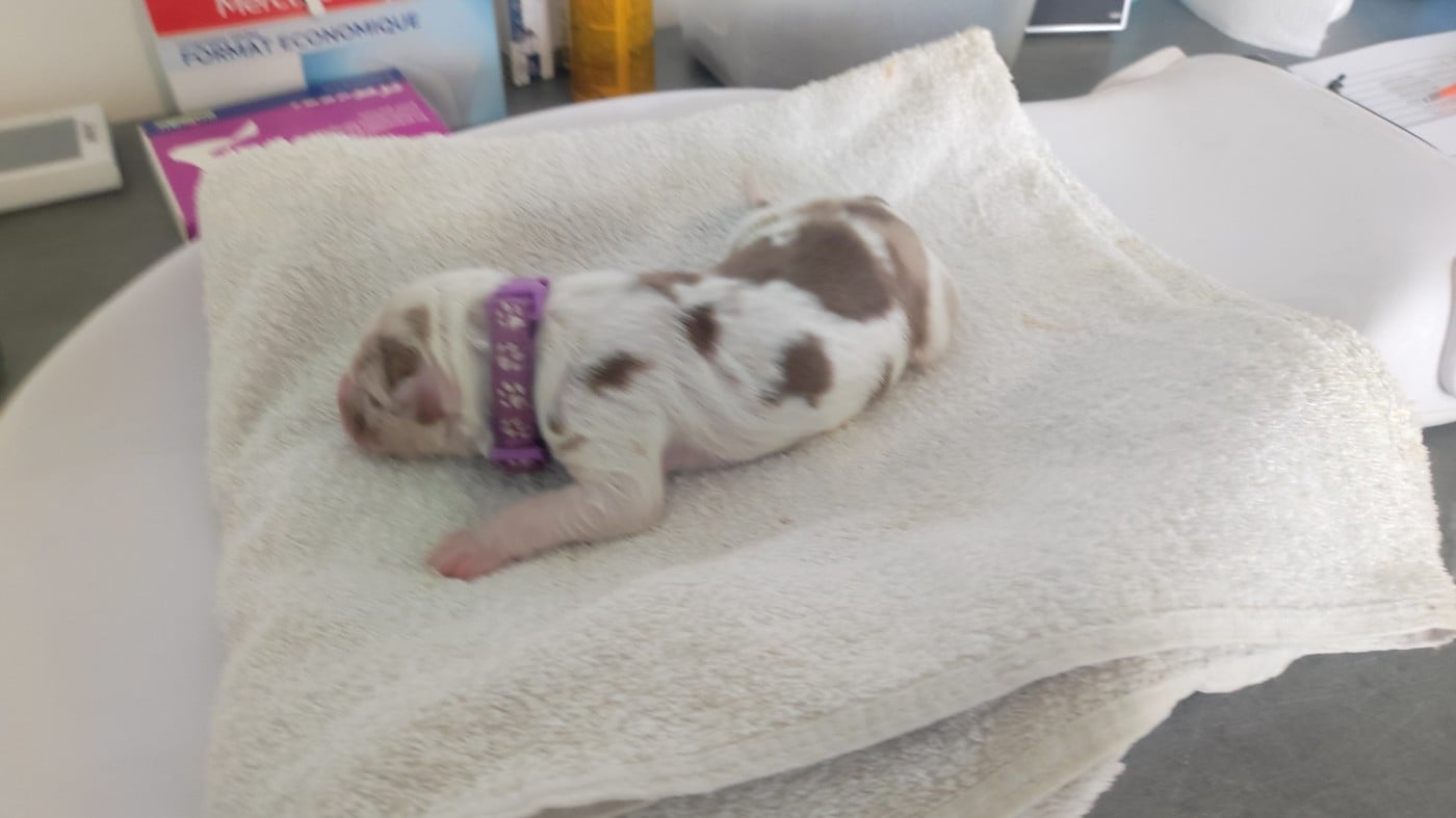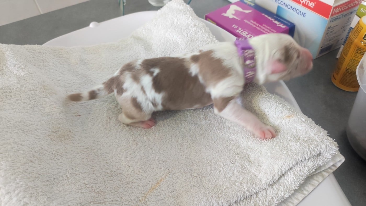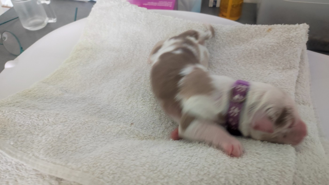 Femelle rouge merle née à 00h08. Poids à la naissance 420 grammes.