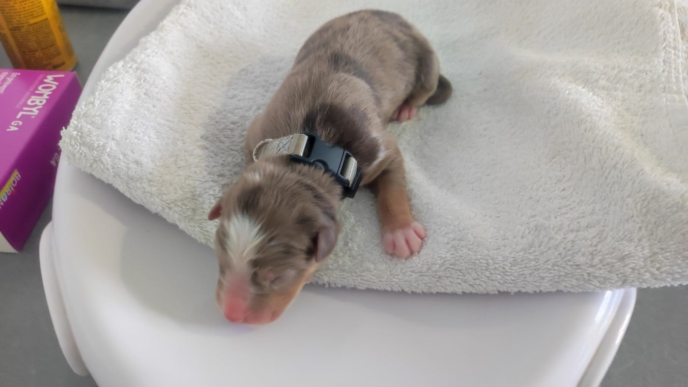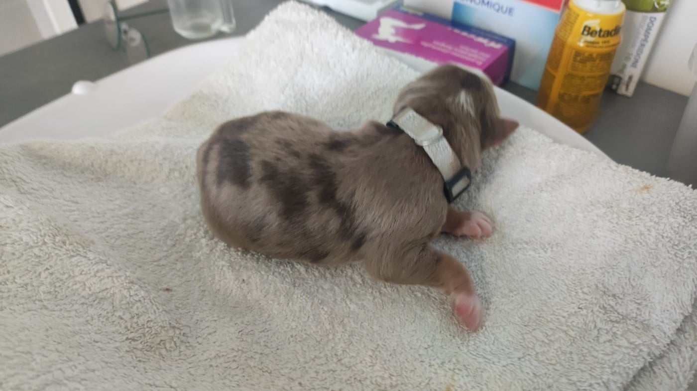Rouge merle né à 23h07. Poids à la naissance 390 grammes